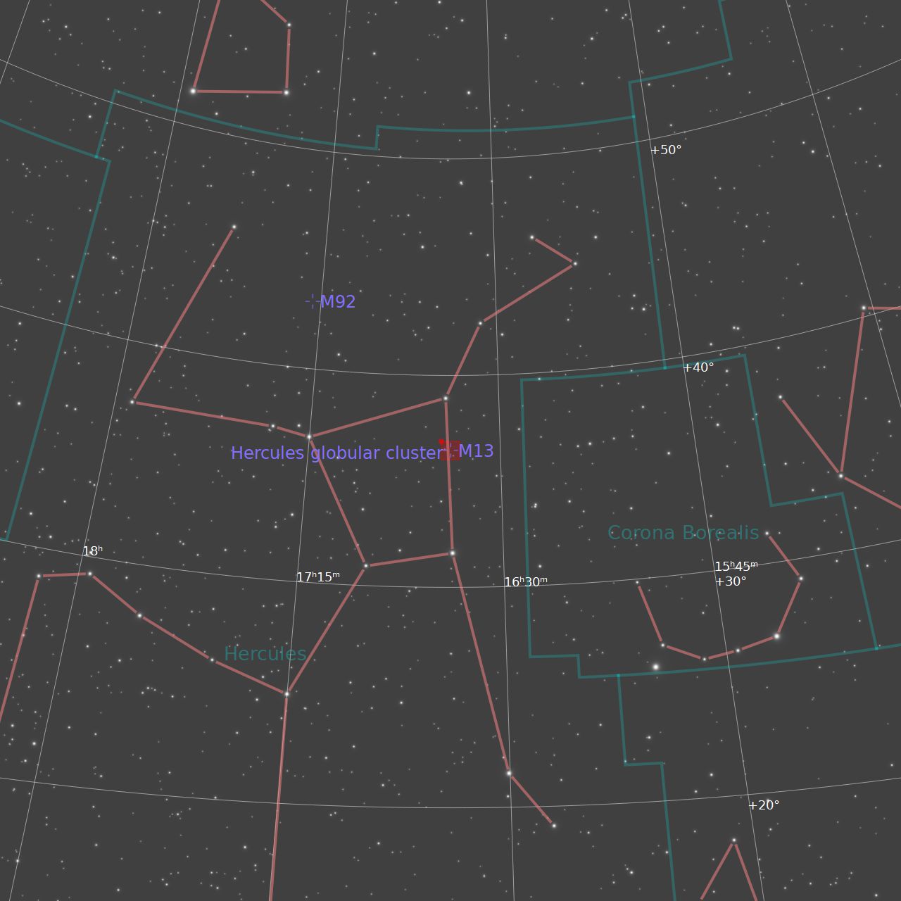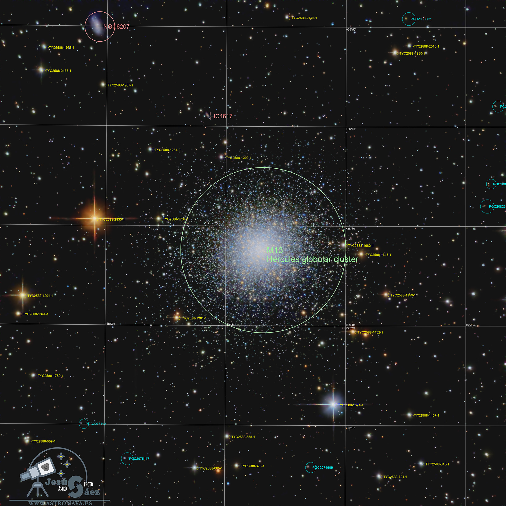 El cúmulo globular M13 es un conjunto de unas 300.000 estrellas que orbitan alrededor del centro de nuestra galaxia, la Vía Láctea. Se encuentra en la constelación de Hércules, a unos 25.100 años luz de distancia de la Tierra. Su diámetro es de unos 145 años luz, lo que significa que la luz tarda ese tiempo en cruzar de un extremo a otro del cúmulo.