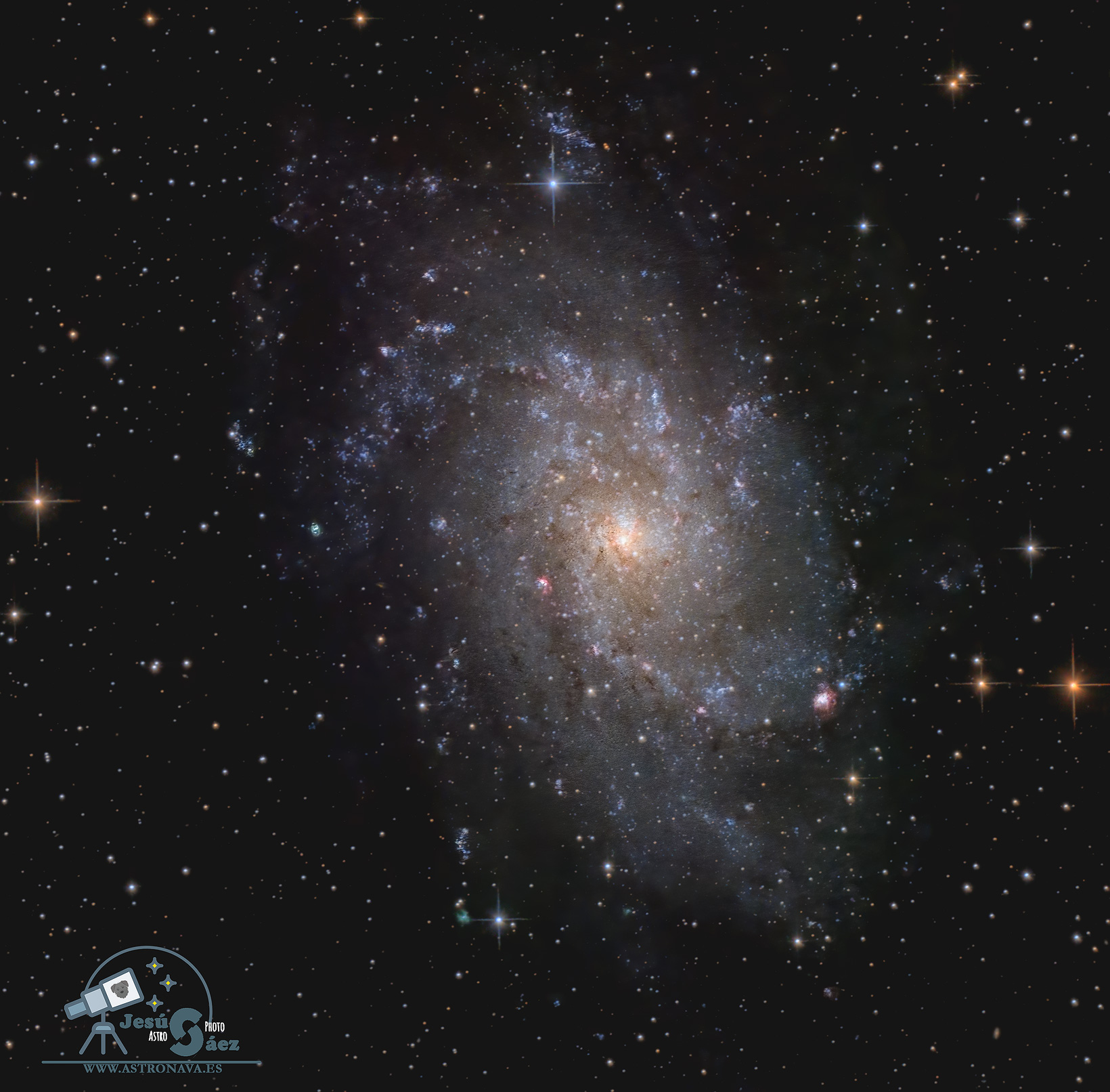 La Galaxia del Triángulo tiene un diámetro de más de 50.000 años luz y se encuentra a una distancia de 2,8 millones de años luz de nosotros. A pesar de su tamaño, es pequeña en comparación con sus vecinas mayores, la Vía Láctea y la Galaxia de Andrómeda, que tienen entre 200.000 y 400.000 millones y un billón de estrellas, respectivamente. Sin embargo, su tamaño es similar al de la mayoría de las galaxias espirales del universo.